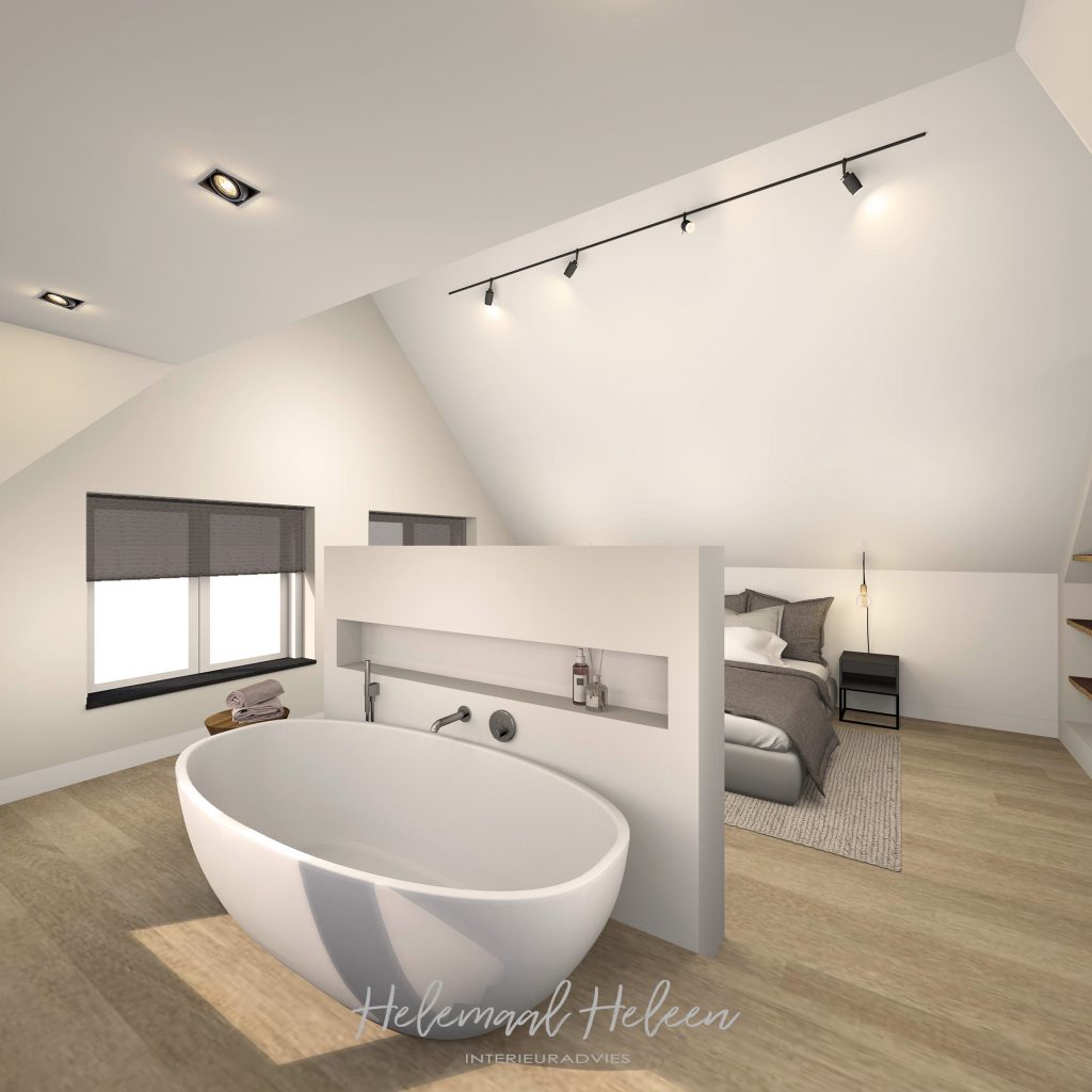 Door middel van twee dakkapellen ontstond er boven zoveel ruimte, dat ik hier een grote masterbedroom met vrijstaand bad kon creëren, een logeerkamer, een ruime overloop met werkplekje, badkamer en apart toilet.